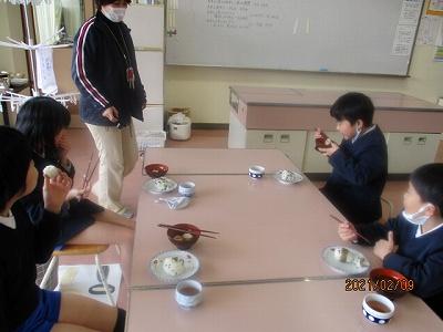 家庭室では、おまん小豆の先生と2年生をお招きして「いただきまーす」