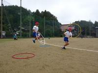 雨が上がってきたので、外に移動して障害走。平均台・フープ・ピンポン玉運びをしてゴールです。