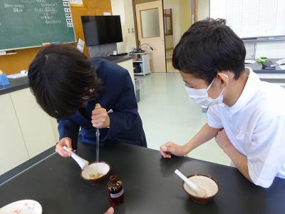 【5年理科】子葉の役割を調べました。子葉をすりつぶしてヨウ素液を加えて実験しました。