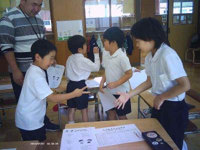 【1・2年】スクールカウンセラーの先生のファシリテートのもと、友だちのことをさらに知るために質問し合いました。楽しきインタビューし合いながら、好きな食べ物や好きな遊びのことを詳しく知ることができました。