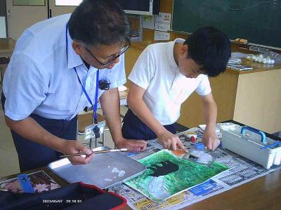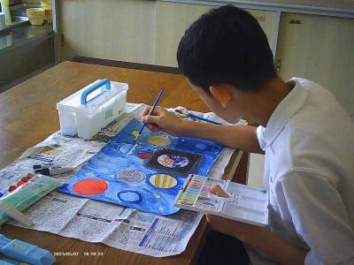 歯ブラシや網などを使って、いろいろな描き方を工夫しました。