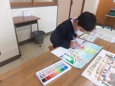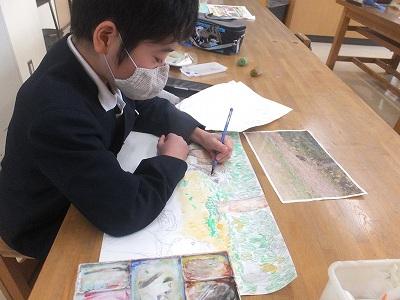 図工室では5,6 年生が絵に丁寧に色を塗っていました。