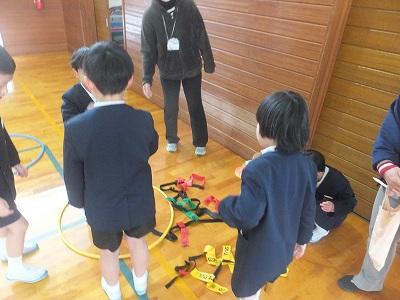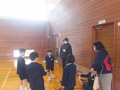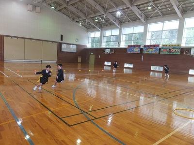 体育館では、しっぽ取り鬼ごっこ。1,2年生のお楽しみ会本番中。