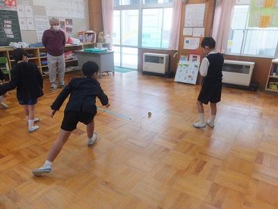 生活科では、こま回し。こまの先生は校務員さんです。ありがとうございます。