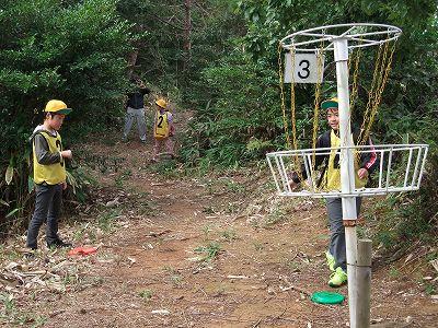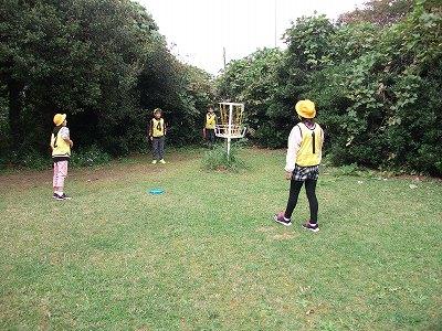 おいしいお弁当を食べたら、午後はディスクゴルフ。フリスビーを何回でゴールに入れられるかを