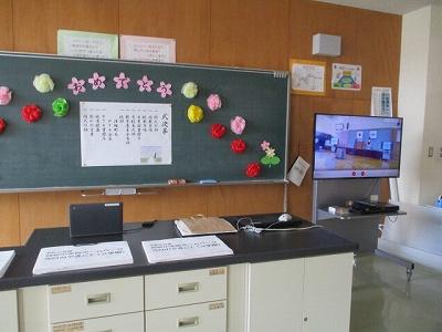 玄関にも保護者控室前にも、お祝いのお花がずらり。オンライン中継の準備もOK。