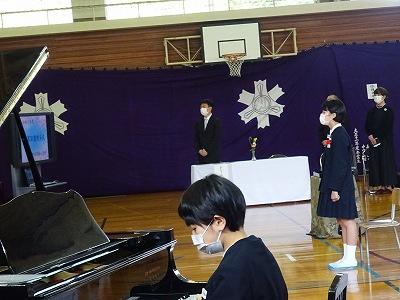 国歌斉唱。伴奏は先生。校歌斉唱。伴奏は5年生。
