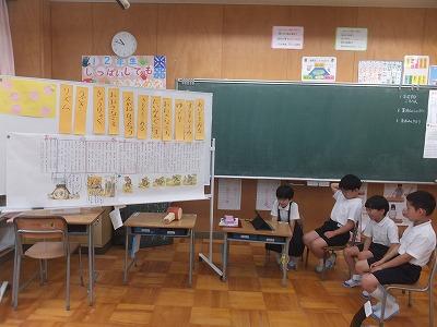 1,2年生。1年が演じたおむすびころりんのビデオを見て、2年生がアドバイス。