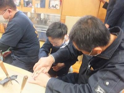 子どもたちも手ほどきをうけながら チャレンジ!! うーん、固いっ!!