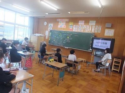 1,2年生、音楽。「やまびこさーん♪」「やまびこさーん♪」続きの歌詞は自分たちで考えて、楽しんでいました。