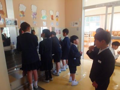 さて、本日は、1年生と一緒に食べる初めての給食です。高学年が、1年生のおぼんの横にすてきな飾りを