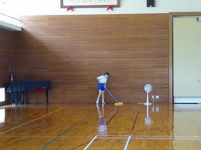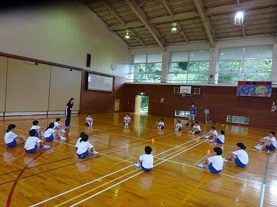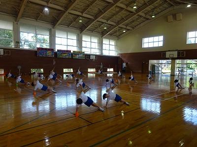 体育館での運動会練習もスタートです。扇風機を4台まわし、水分補給をしつつ進めます。