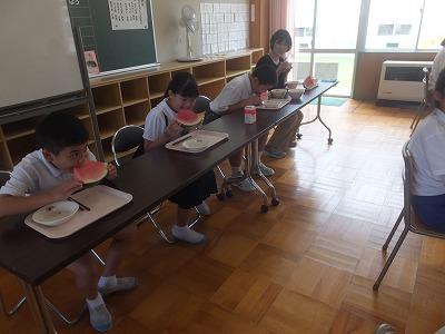 お昼。今日は特別のデザートつき。先日いただいた西瓜です。