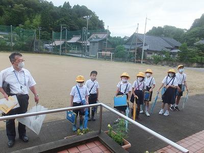 4年生が社会見学に出かけました。ちびのバッタがマコモダケの上からお見送りです。