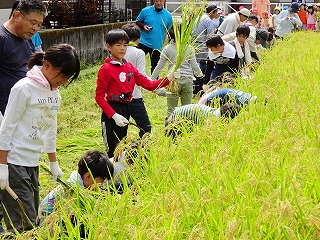 5月9日に田植えをした苗が大きく育ち、9月11日、学校田の稲刈りを行いました。