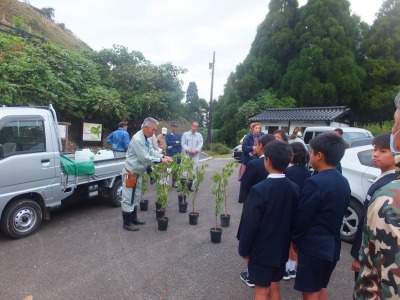 6年生が、刈安コミュニティープラザの方々のお計らいで、しだれ桃の植樹をしました。