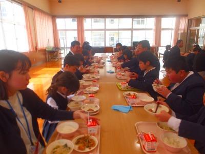ランチルームで、6年生とともに食べる最後の給食。一日早くひなあられがでました。