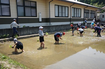 刈安小学校の児童27人と寺尾保育園の4歳児・5歳児は、営農組合の方から苗の植え方を教えていただき、はだしで田んぼに入り、「かぐらもち」の苗を植えました。