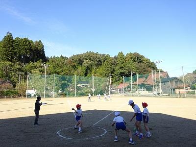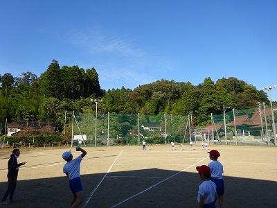 青空の下、ソフトボール投げ。いい気持ちで、それー。飛んだ、飛んだ!!