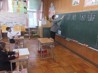 英語。5,6年生は大文字と小文字をマスターしようと、カードをペアにして
