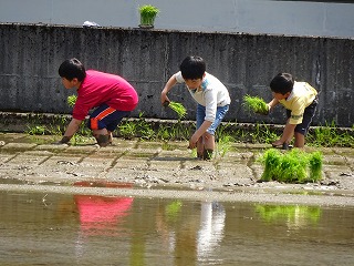 5月12日には、田植えを寺尾保育園の子どもたちといっしよに行いました。