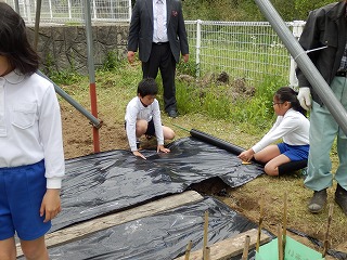風があったので、子どもたちはこのマルチシートを被せるのに