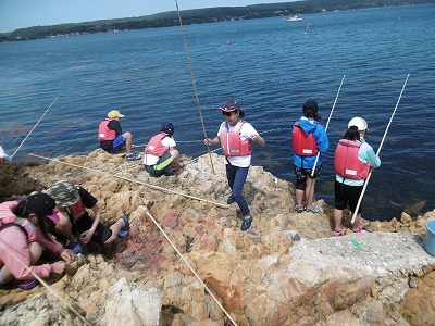 最後の活動は釣り。えさをつけるのもこわごわでした。