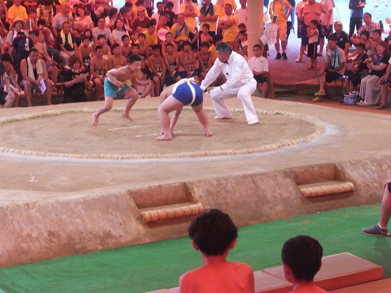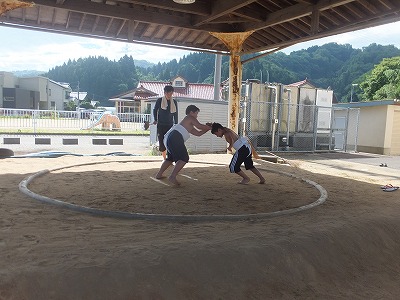 お父さん方の体を借りて、ぶつかりげいこをしたのち、試合形式です。