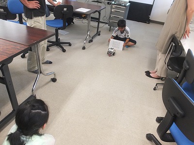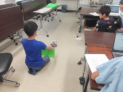 高学年は、ロボットに指令を出して、壁の前でストップさせたり、色を識別させたりしました。