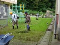 長寿会の方と子供たちが一緒にグラウンドの草むしりをします。