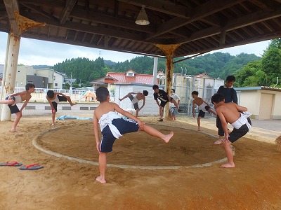 7/10 夕方、第3回の相撲の稽古がありました。本日もお父さん、お母さん方、そして大会にはまだ出られない低学年児童や女子の応援もあり、気合いが入ってきた感じです。
