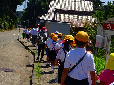 児童が保育園児と手をつなぎ、後方を地域の皆様に守っていただきつつ、歩みました。