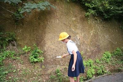 こちらは野外学習 6年理科 原地区にて地層調べ中
