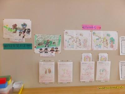 低学年の学習履歴。田植えの絵。たねの観察。国語「はなのみち」の吹き出し。
