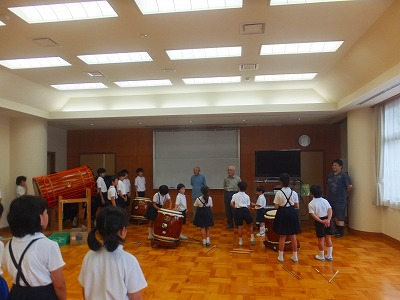 7月9日 5限 刈安コミュニティープラザのホールにて、今年度第一回の源氏太鼓の稽古がスタートしました。ご指導してくださったのは、大谷さん、高橋さん、高野さんです。