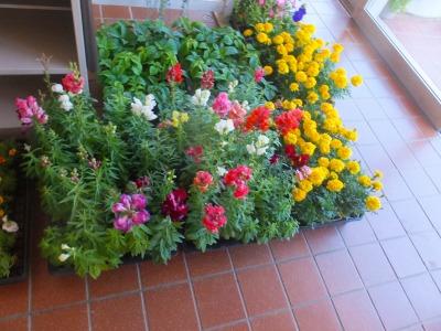 玄関は花壇に植える花でいっぱい。校務員さんがさっそく植え始めてくださいました。