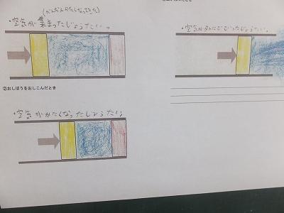 4年生、理科 とじこめた空気について図を描いて個々の考えを掲示。