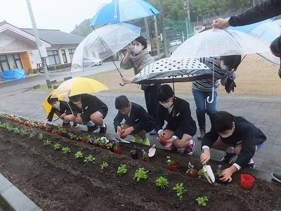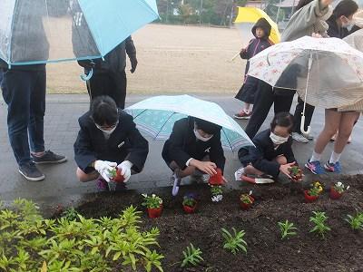 予定していた花壇整備は極小に縮め、子どもたちはパンジーを一鉢だけ植えることにしました。おうちの方々が傘をさしかけて下さり、さっと植えました。