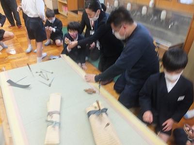 子どもたちも手ほどきをうけながら  チャレンジ!!    うーん、固いっ!!