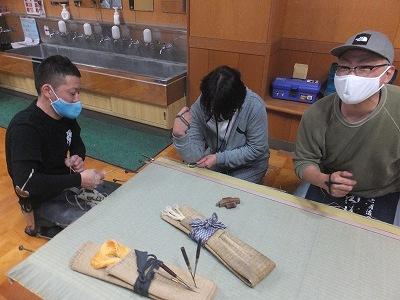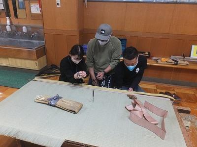 畳の表がえの作業で、たたみのへりを縫う体験を 先生たちがやってみました。