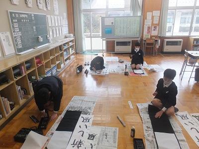 書き初めの稽古。3年生に「書く姿勢のお手本」を示す4年生。