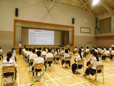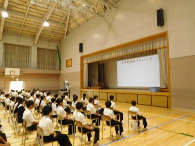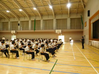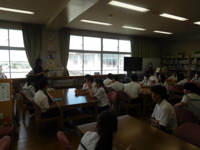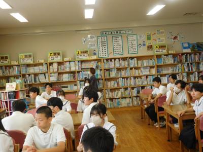 今日は1学期終業式です。暑さ対策のため、終業式は放送で行い、各学年の集会も短時間で実施しました。明日からは夏休みとなります。是非有意義に過ごして欲しいと思います。また今日は朝読書の時間に、保護者の方による図書館での読み聞かせ活動の日でした。生徒は真剣にお話を聞いていますね。