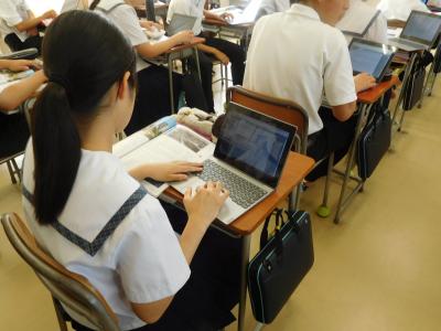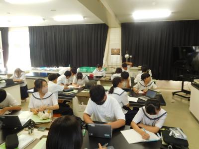 1年生は、保健体育で水泳の授業です。7月から水泳がはじまり、随分とプールで泳ぐことに慣れてきたようです。次回は25㍍の実技テストがあるため、この時間は泳法の確認を行っています。息継ぎの仕方や手の水の掻き方はどうでしょうか?2年生は、理科の時間です。光合成に必要なことは何か?振り返りをきちんと書く時間をとっていますね。
