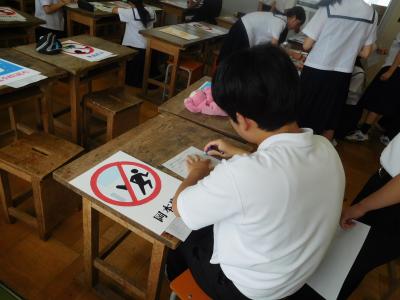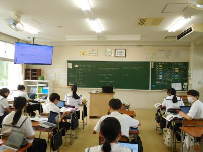 1年生は、理科の時間です。ガスバーナーの使い方や、物質の分類のまとめ問題をしています。2年生は、美術の時間です。生徒が製作したピクトグラムポスターをお互いに鑑賞しています。友達の作品にはどんな工夫があるのか、お互いに意見交換していますね。3年生は、英語です。与えられた課題に対してICTを活用しながら英語で質問を考えています。