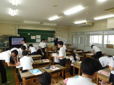 1年生は、理科で物質の質量や密度を学んでいます。2年生は、英語ですね。私たちの身近に見られるロボットについて紹介しています。3年生は今日は復習テストです。どの生徒も真剣な表情で答案と向き合っていますね。