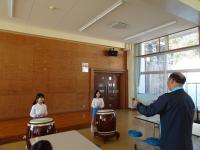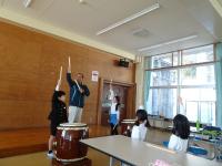1・2年生がでんでこ太鼓を坂田先生に教えていただきました。1年生は学校では初めて練習しました。でんでこ太鼓のリズムを少しづつ練習しました。2年生はレベルアップをめざします。