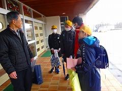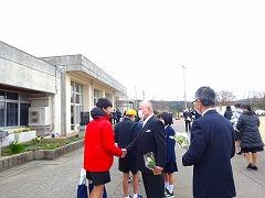 ↑ 教室で荷物を整え、校長室で記念写真を撮り、玄関へと向かいました。すると、…懐かしいお客様です。卒業生へお祝いのメッセージを届けに来てくださいました。