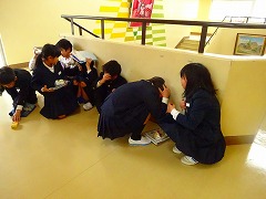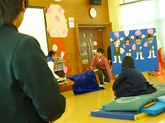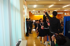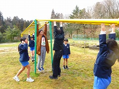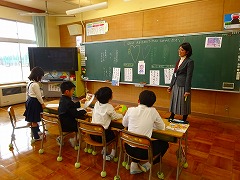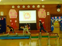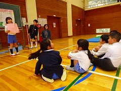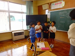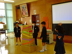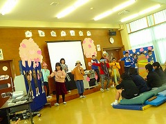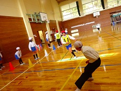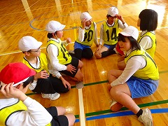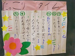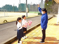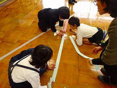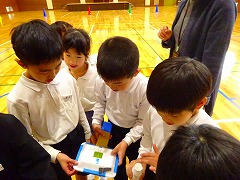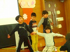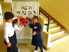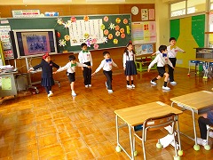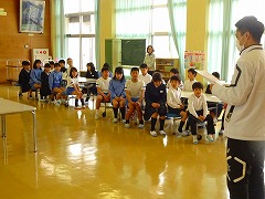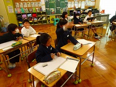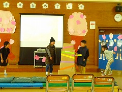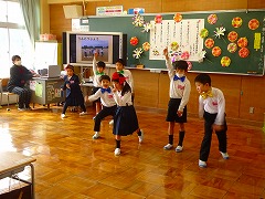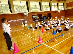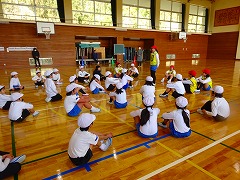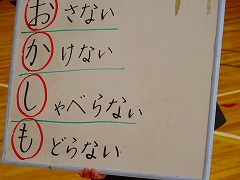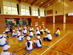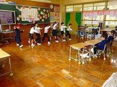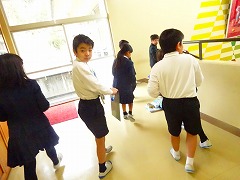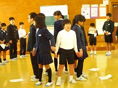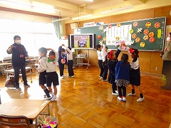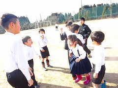 ↓ 2年生がにっこりタイムを企画し、招待してくれました。国語の学習の発展で自分たちで考えた「かわり鬼ごっこ」をいくつも紹介してくれました。乗り物鬼ごっこは、駐車場で休むことができますが、輪っかの中に入れるのは2人までです。ほかの人が入りに来たら、自動的に駐車場から出なければいけません。楽器鬼ごっこや南極鬼ごっこ等、十分な運動量が確保されるものばかりでした。子供たちの発想力の柔軟さには感心しました。