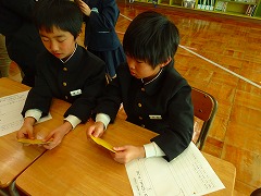 ↓ 6年国語 筆者の言いたいことを100字程度で要約し、互いの要約を読み合っています。どうしてこの言葉を入れた要約したのか、説明することで自分との比較ができ、内容に深まりがみられました。