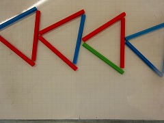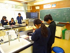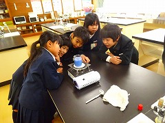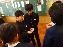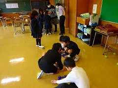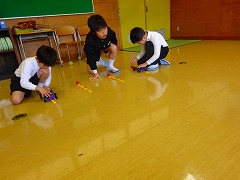 ↓ 3年理科 こちらは磁石の実験です。磁石の性質を用いた遊びを考えています。同じ極同士反発しあう力を利用して、ボールをシュートさせる遊びです。